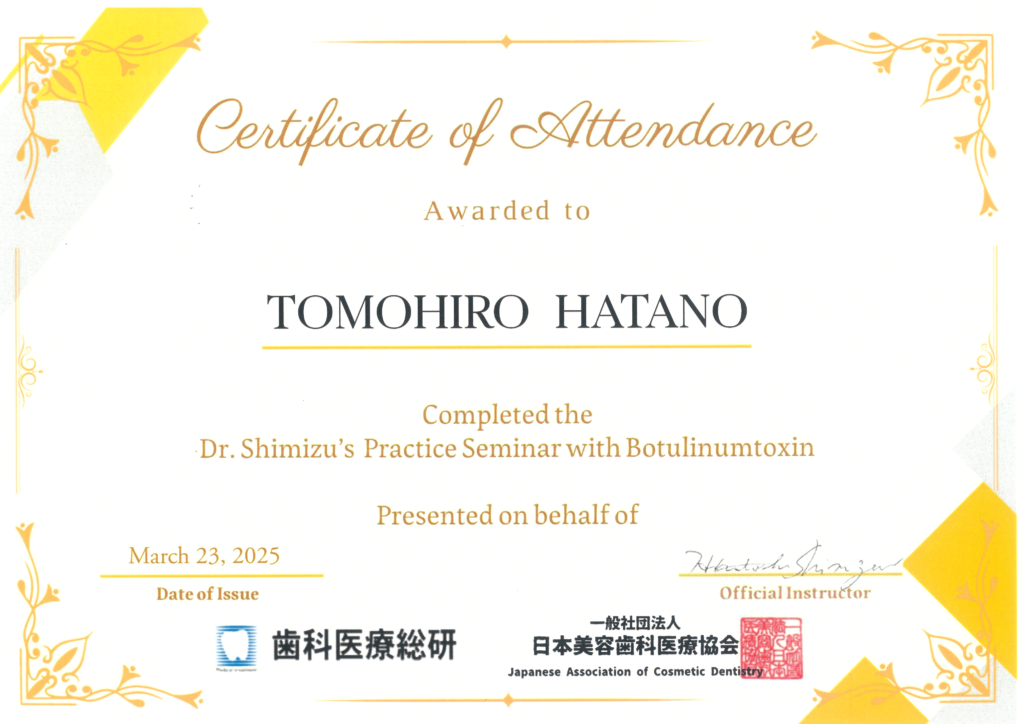 当院は日本美容歯科医療協会より、歯科ボトックスにおける医科歯科連携クリニックとして認定されています。