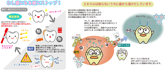 リカルデントでは虫歯菌により、歯から溶け出したミネラル(カルシウムやリン)を元に戻し、歯を元の状態に近づけるミネラルパック効果により歯を補強します。そして虫歯菌により、酸性に(歯が溶けやすく)なったお口を中性にもどしてくれる緩衝材の役目をしています。 当院ではこのリカルデントをたっぷり含んだMIペーストで歯を磨いてからフッ素を塗って歯を強くしています