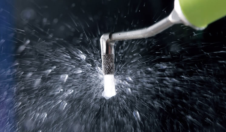 流水下で水流と振動の音波効果 (サブソニック振動)によりバイオフィルムの破壊、洗い流し効果を生かしたプラーク除去を行い、歯面をやさしくツルツルに仕上げます。