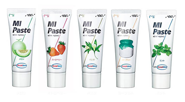 着色除去後、MIペーストを使用し、歯面の仕上げ磨きを行います。 MIペーストは歯にカルシウムの成分を戻りやすくしてくれます。 「再石灰化」を促してくれます。さらに、牛乳由来の成分から抽出した 「リカルデント」が入っており、虫歯に対して高い予防効果が期待できます。