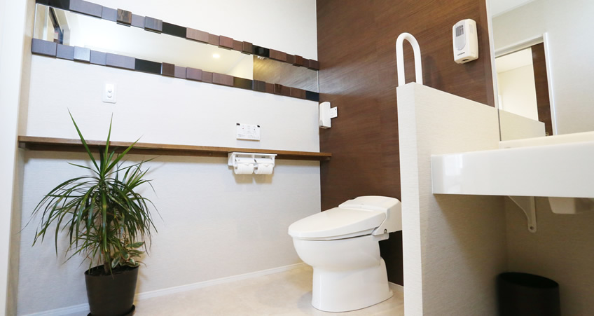 トイレは、男女別になっております。女性用トイレは、車いす・ベビーカーでも入れる広さにし、オムツ交換台も設置しております。他にも、パウダールームも設けておりますので、ぜひご利用下さい。