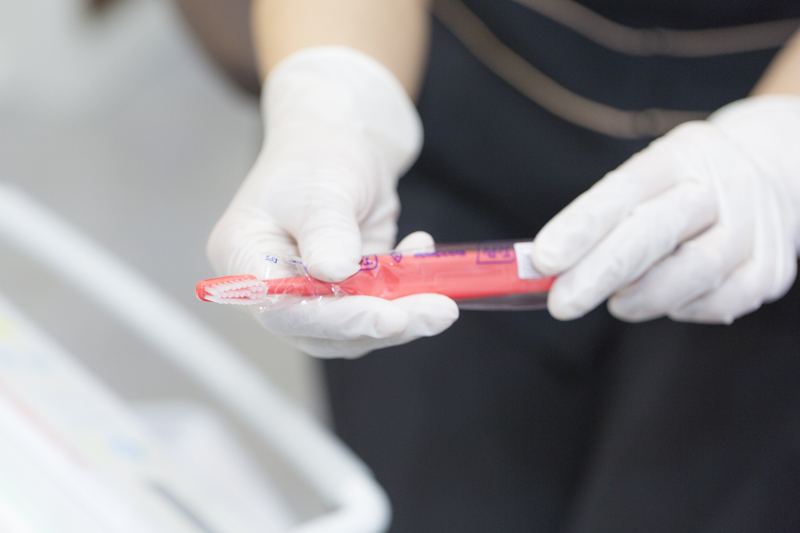 使用するケア用品は、衛生面を考慮し、常に新しい歯ブラシなどを提供しております。また、スケーリングで使用するスケーラーのチップは患者様毎に交換しておりますのでご安心ください。当院の衛生管理については衛生管理のこだわりを御覧ください。