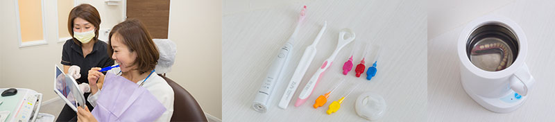 歯とお口の健康を守るための毎日のセルフケアについて指導させていただきます。患者様のお口の中の状態に合わせたブラッシングや、ブラッシング困難な患者様へは電動歯ブラシ、デンタルフロス、歯間ブラシ、舌ブラシをご提案させていただきます。入れ歯の方へは超音波洗浄などのメンテナンスの仕方をお伝えしておりますので、気になることは気軽にお申し付けくださいませ。