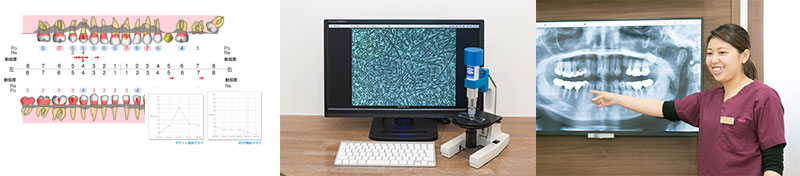 当院では患者様の状態に合わせて「歯周精密検査」、「レントゲン検査」、「細菌検査」を実施し、歯ぐきの状態や虫歯の有無など詳細なお口の中の状態を確認します。