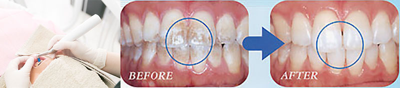 流水下で水流と振動の音波効果(サブソニック振動)によって起きる泡によりバイオフィルムの破壊、洗い流し効果作用を生かしたプラーク除去を行い、歯面を優しくツルツルに仕上げます。