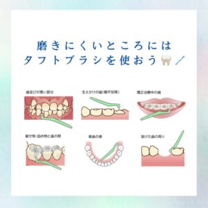 歯ブラシで磨いた後、タフトブラシでの清掃を追加することで、より効率よくプラークを除去することができます。
