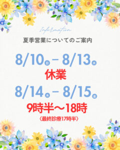 ☑️8/14(木)〜8/16(土)〜18時(最終診療17時半)