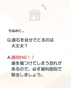 薬局などで売っているセルフの歯石取り(鎌型の器具)を使って歯石をとっている患者様もいらっしゃいますが、歯科医院での専用器具を使って歯科衛生士にとってもらうことを推奨しています。